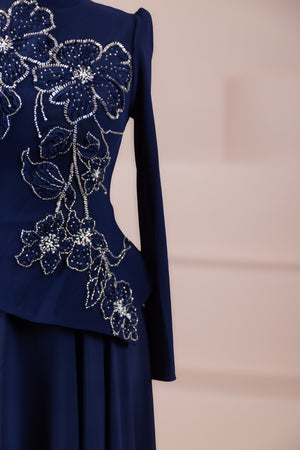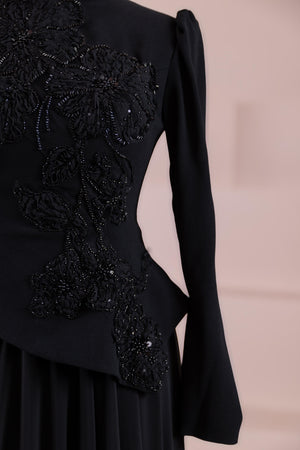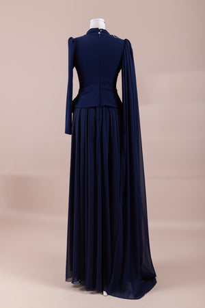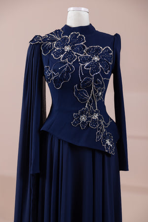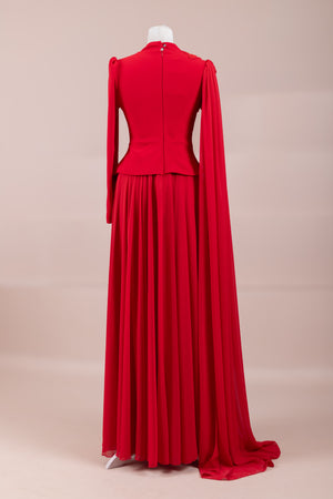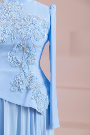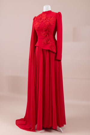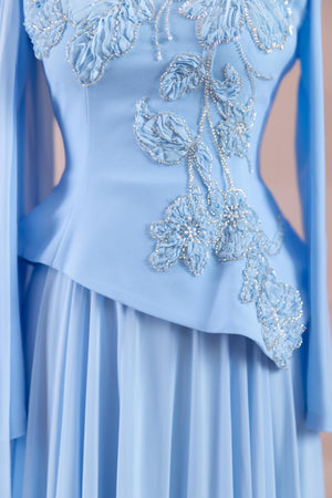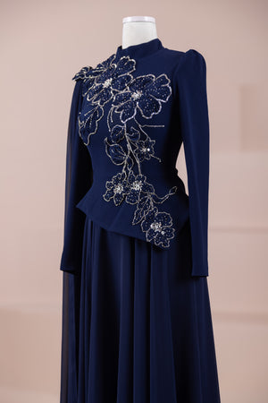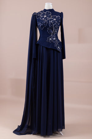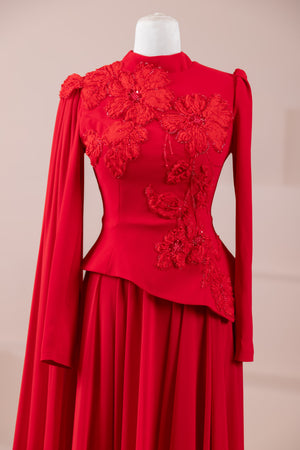 Coupe du haut du corps• Col montant (col droit).• Ligne d'épaule classique, manches longues et coupe droite.• Il y a des ouvertures coupées sur les côtés du corps qui créent une asymétrie.• La partie inférieure du haut est coupée de manière asymétrique, plus longue à droite, plus courte à gauche.• Appliques florales en relief sur la poitrine et le buste.Coupe de jupe• Coupe de jupe circulaire complète ou semi-circulaire qui s'ouvre largement à partir de la taille.• Le tissu étant léger, il crée un effet plissé ample qui tombe vers le sol.• Il y a un léger allongement de la traîne vers l'arrière.