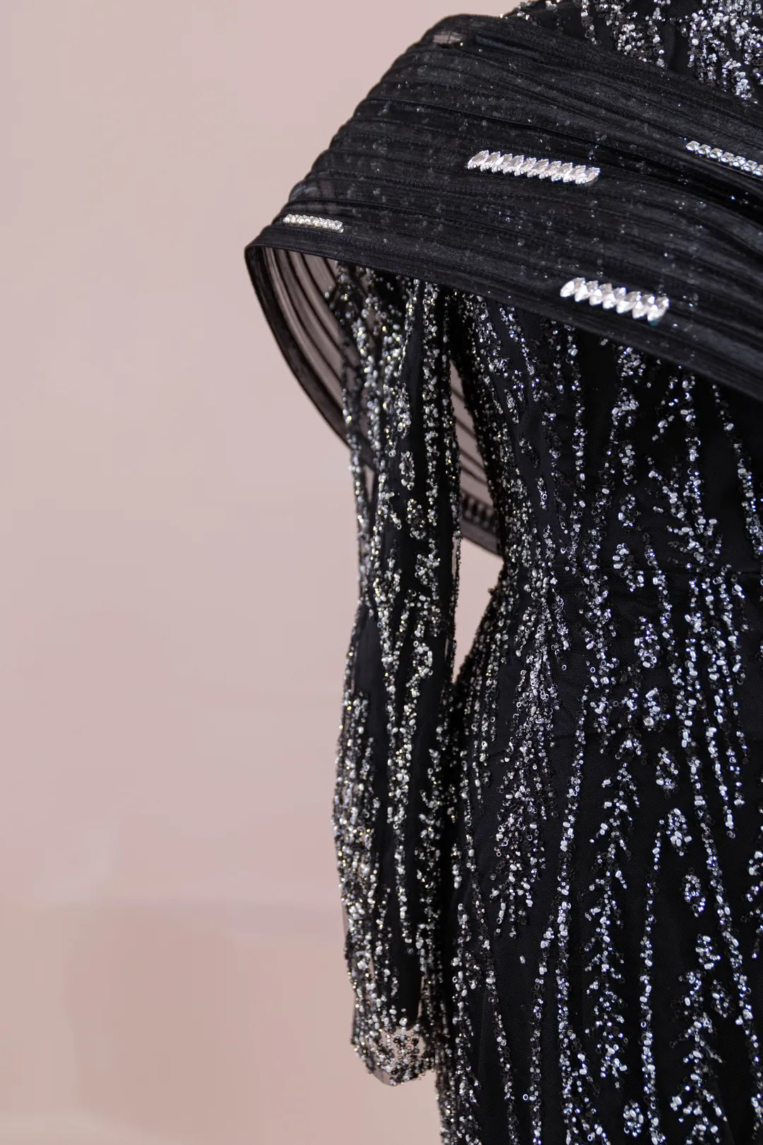- Coupe : Poisson, design drapé à une épaule. Col montant ; look moderne et élégant
