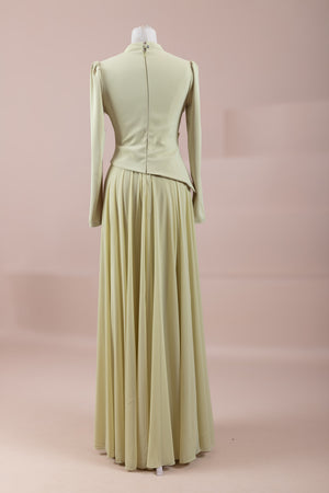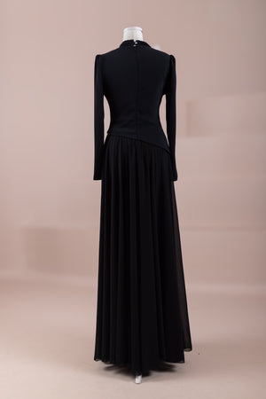 Le haut est ajusté au corps avec une coupe slim fit. La taille est conçue avec une forme légèrement asymétrique, tandis que la partie inférieure est fluide à partir de la taille avec une jupe en coupe A. La longueur maxi offre une silhouette élégante et équilibrée. Les épaules présentent une forme légèrement structurée.