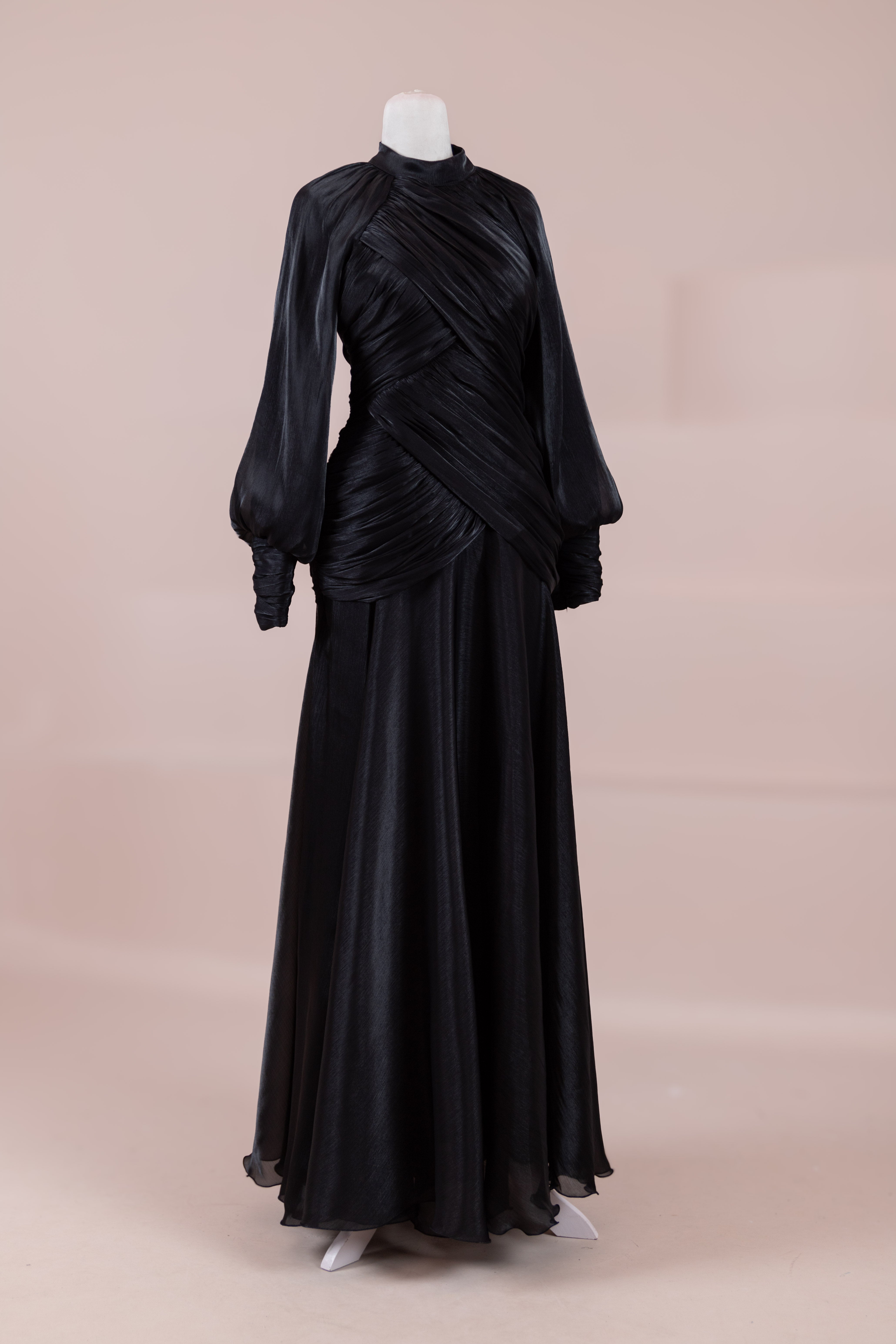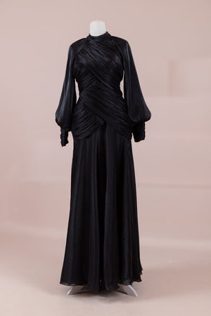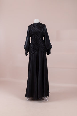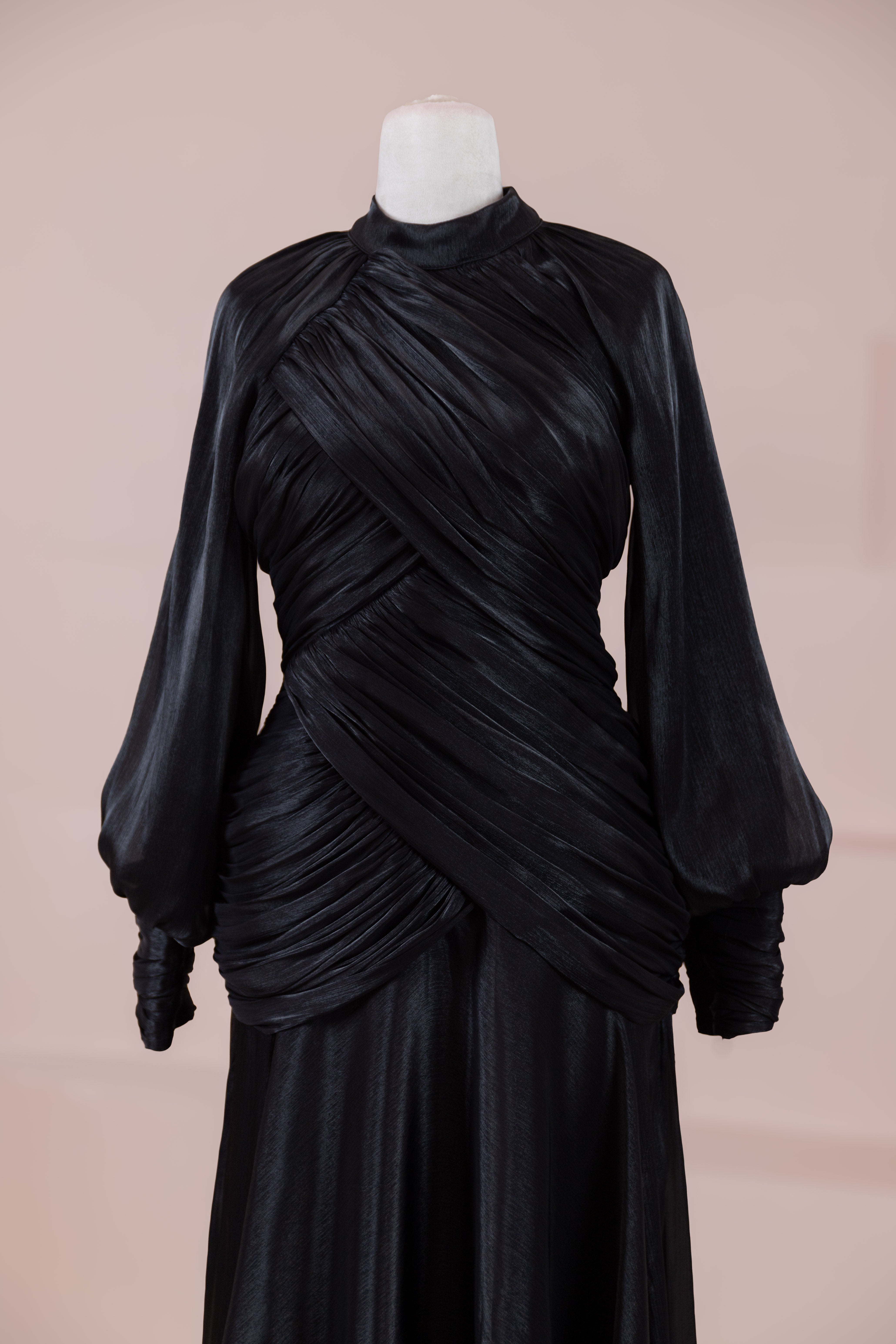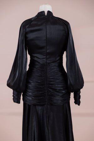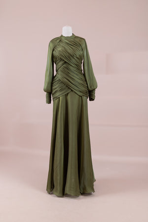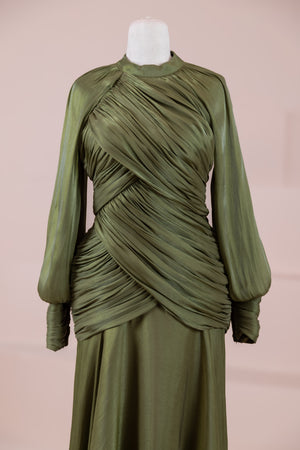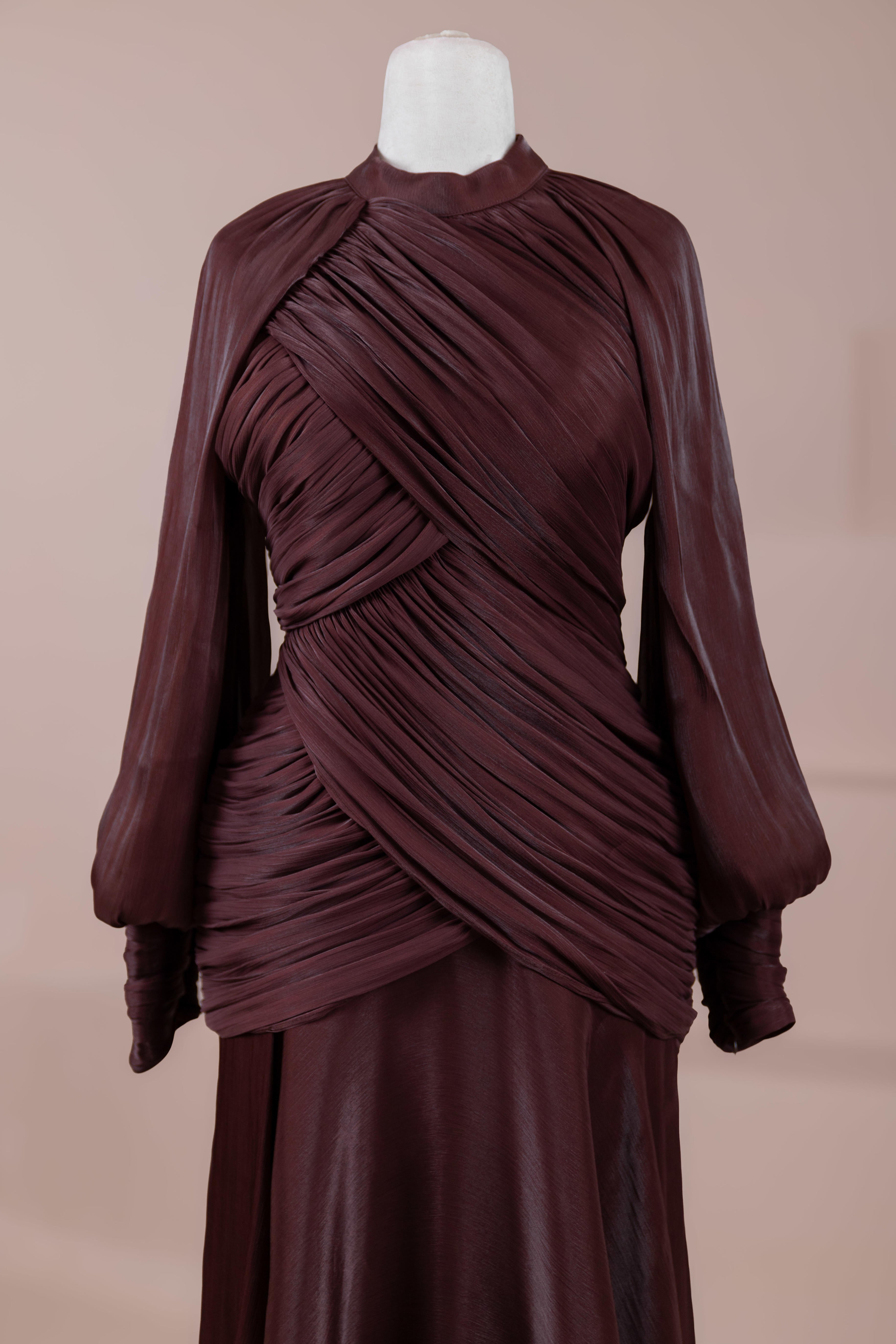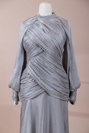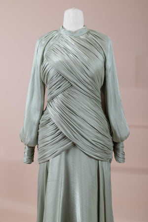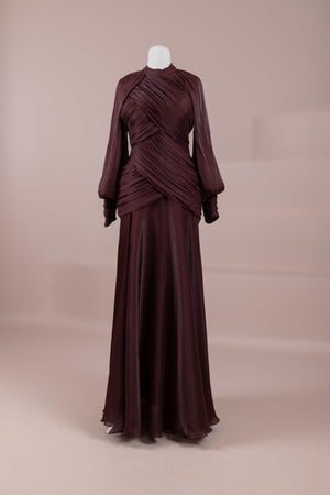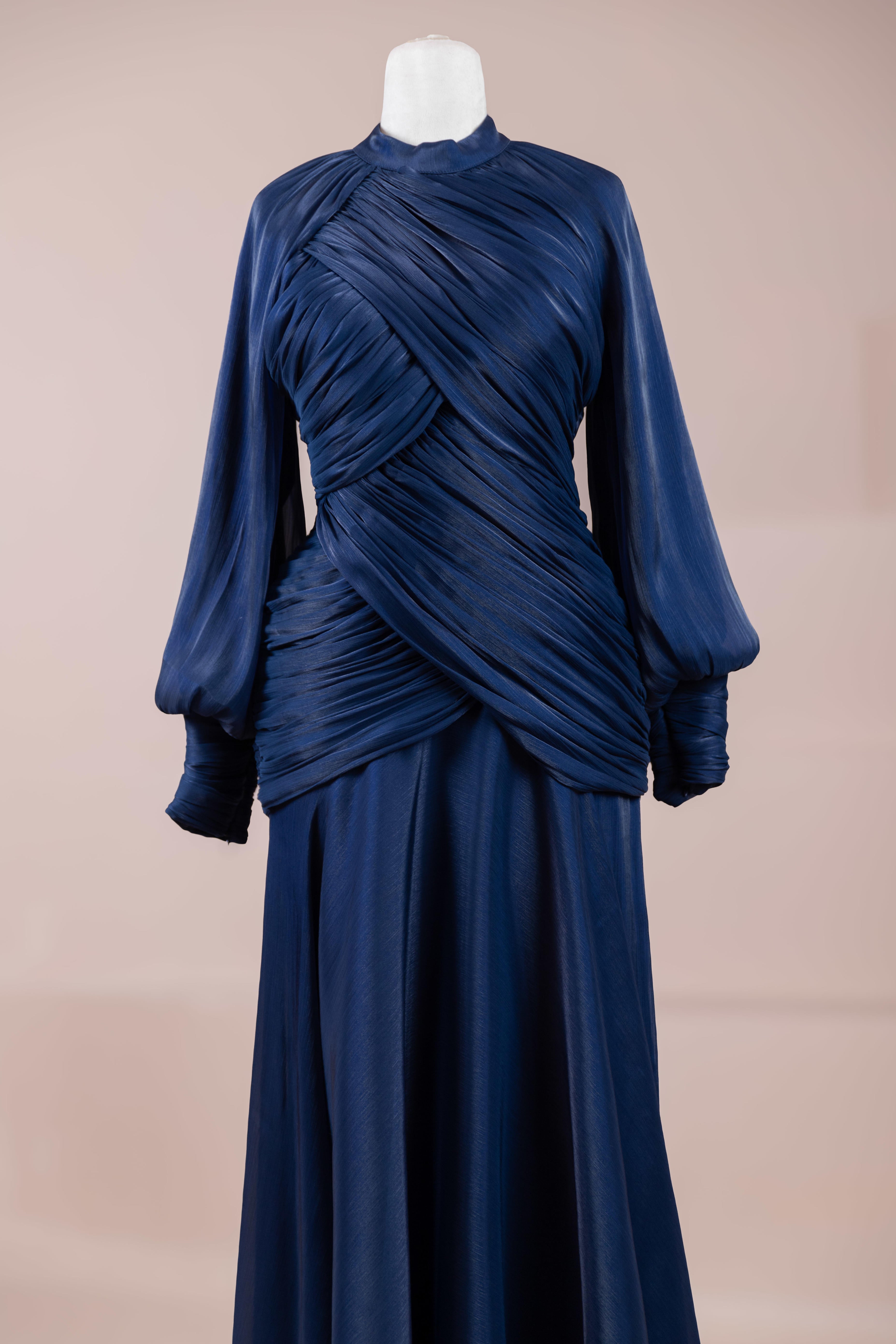 Cette création élégante et fluide présente une silhouette féminine grâce à son haut drapé ajusté au corps et sa jupe fluide. Sa coupe à col haut et manches longues confère un look sophistiqué, tandis que les détails drapés croisés à la taille sculptent la silhouette avec élégance. Les manches rassemblées aux poignets apportent un volume doux au design. La jupe longue et fluide offre liberté de mouvement et confort.