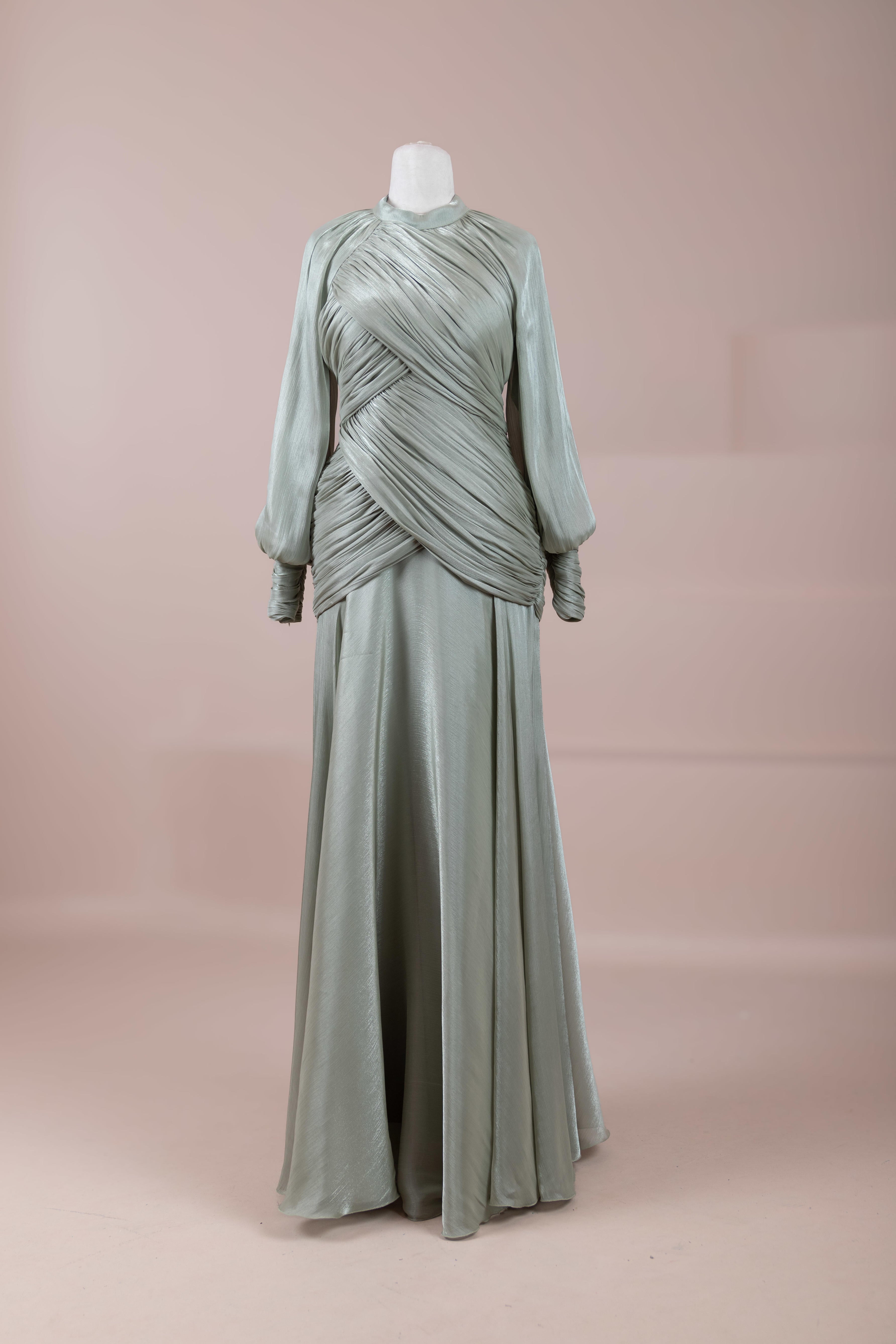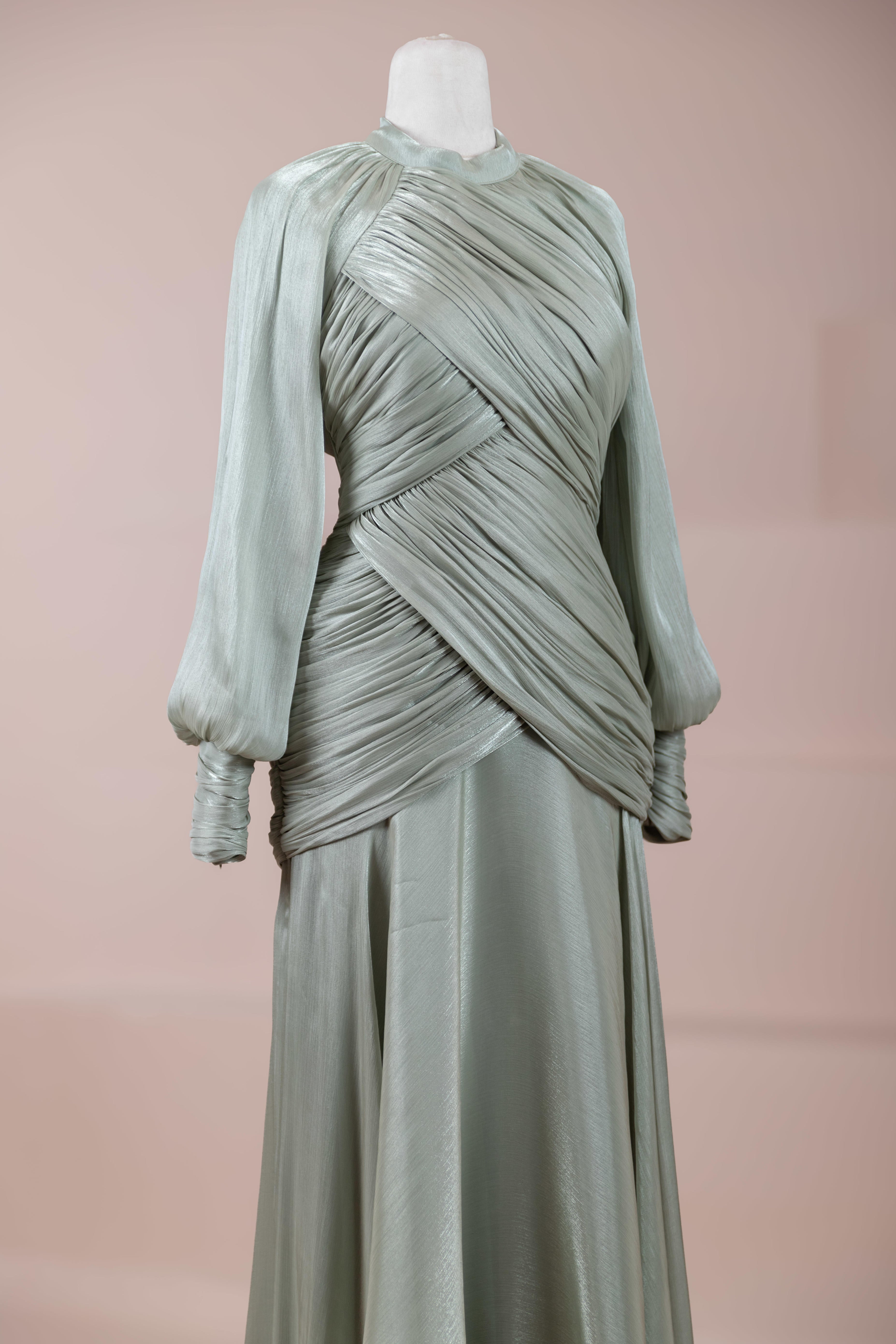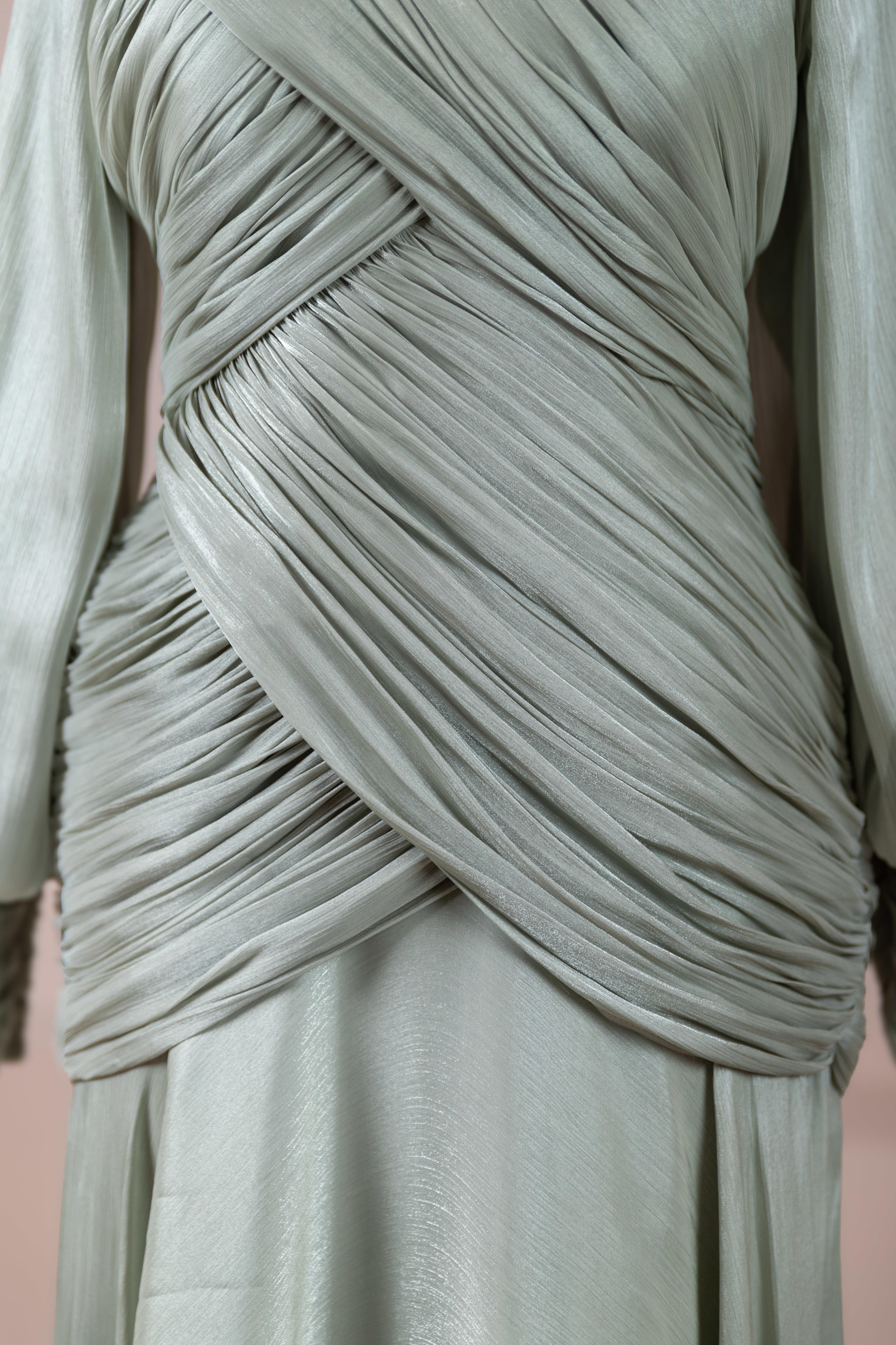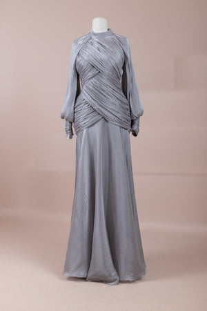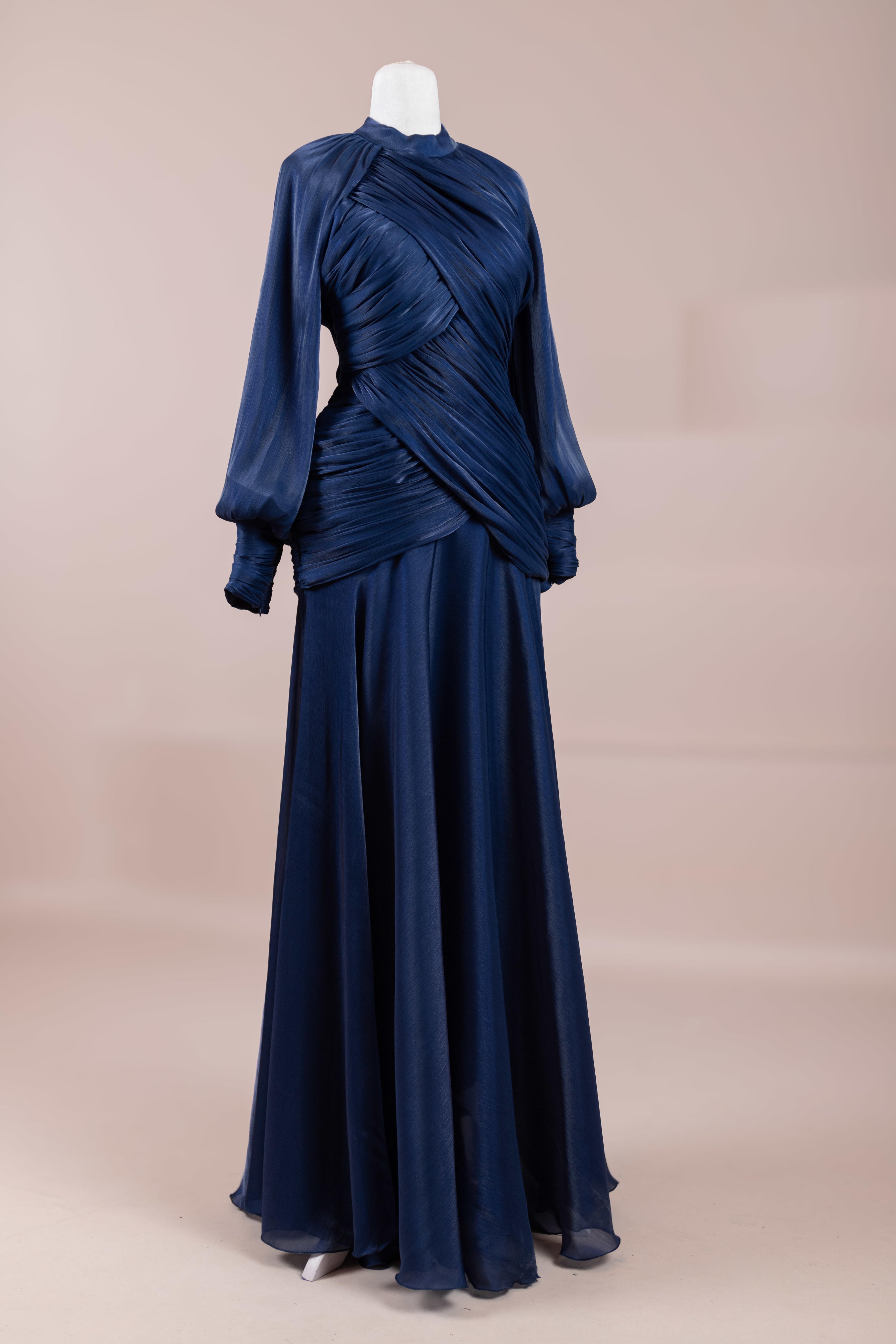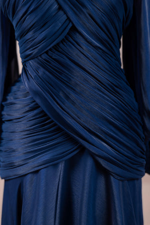 Cette création élégante et fluide présente une silhouette féminine grâce à son haut drapé ajusté au corps et sa jupe fluide. Sa coupe à col haut et manches longues confère un look sophistiqué, tandis que les détails drapés croisés à la taille sculptent la silhouette avec élégance. Les manches rassemblées aux poignets apportent un volume doux au design. La jupe longue et fluide offre liberté de mouvement et confort.