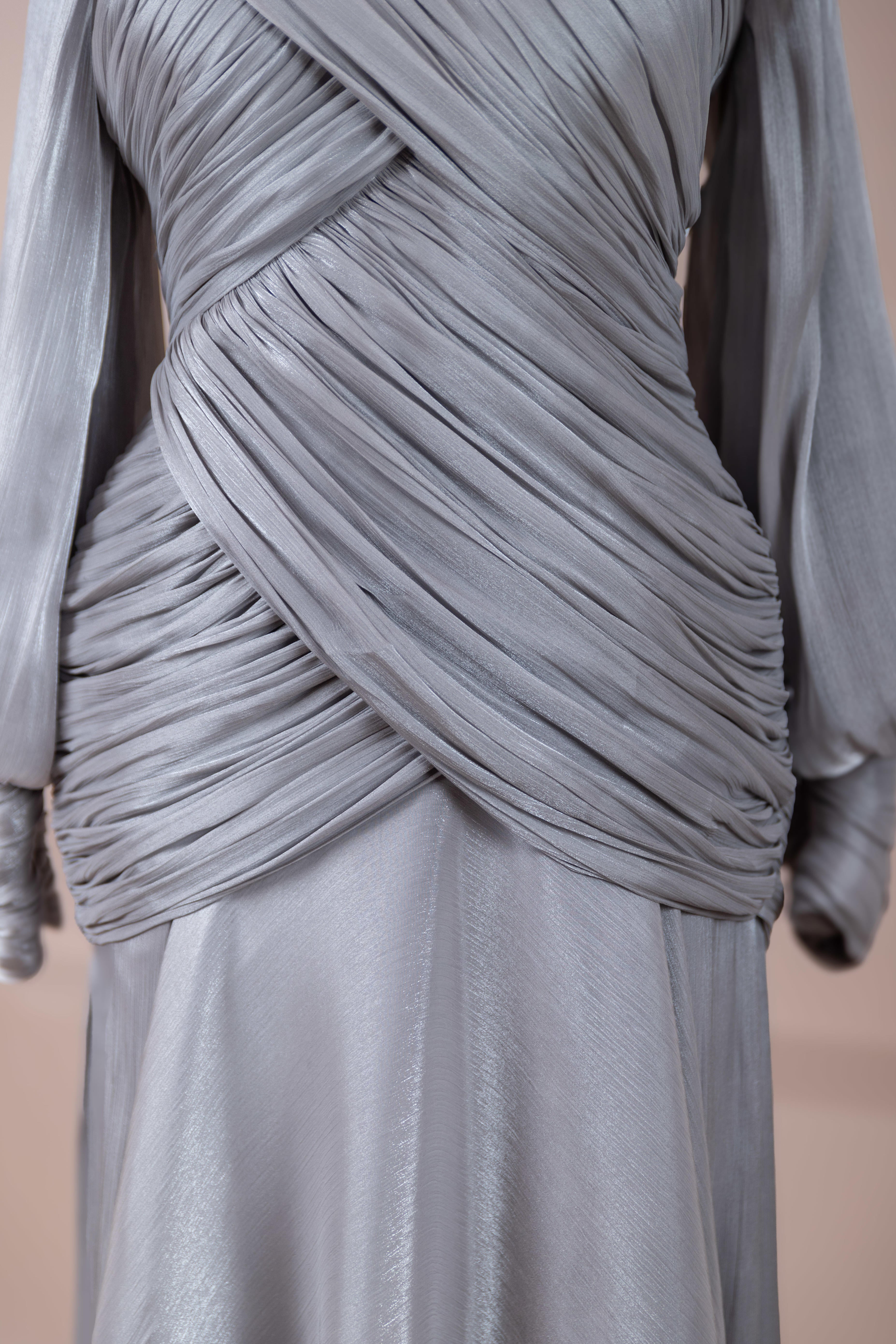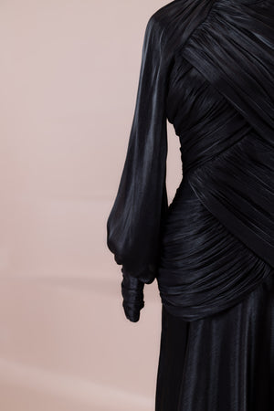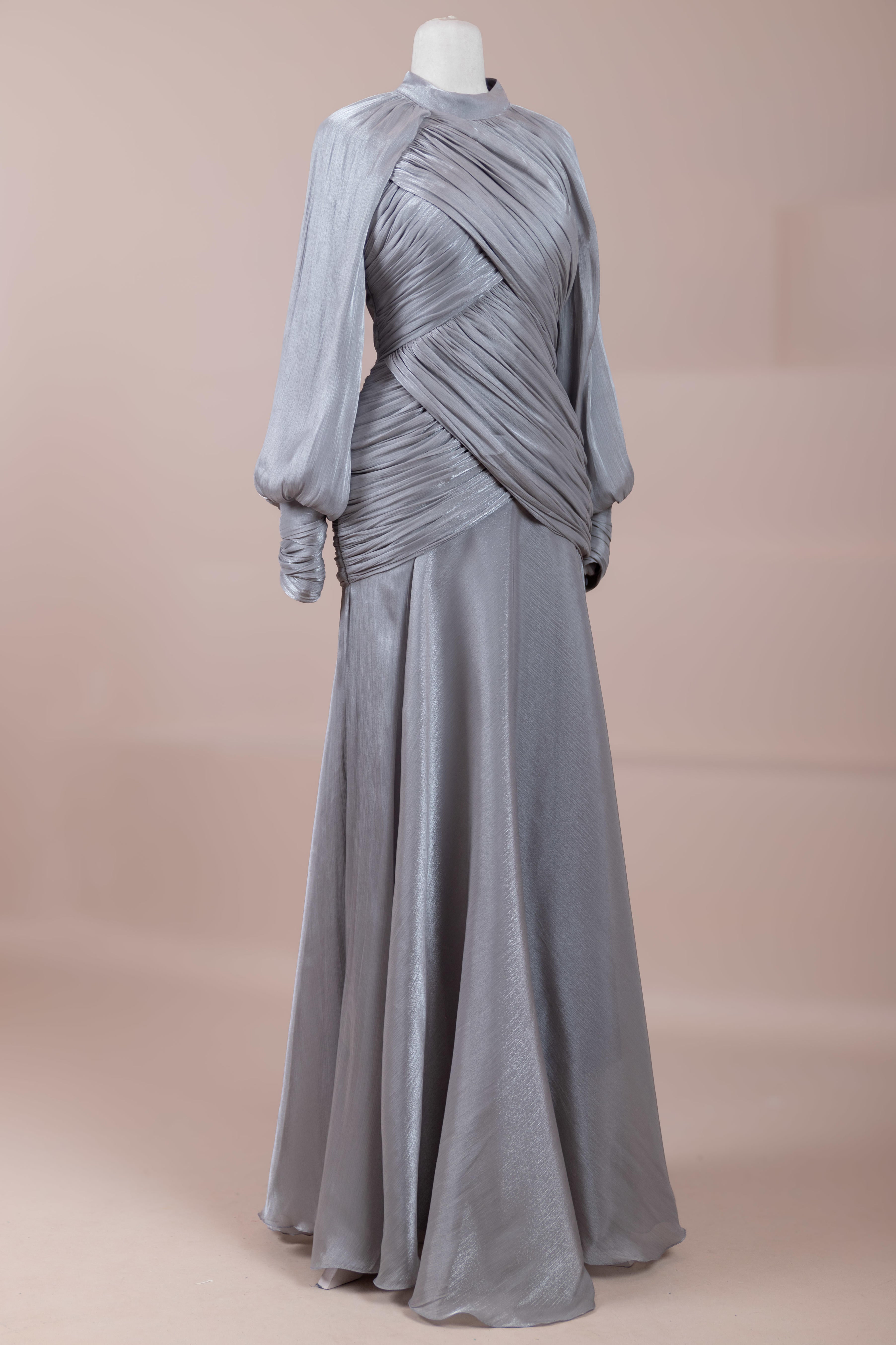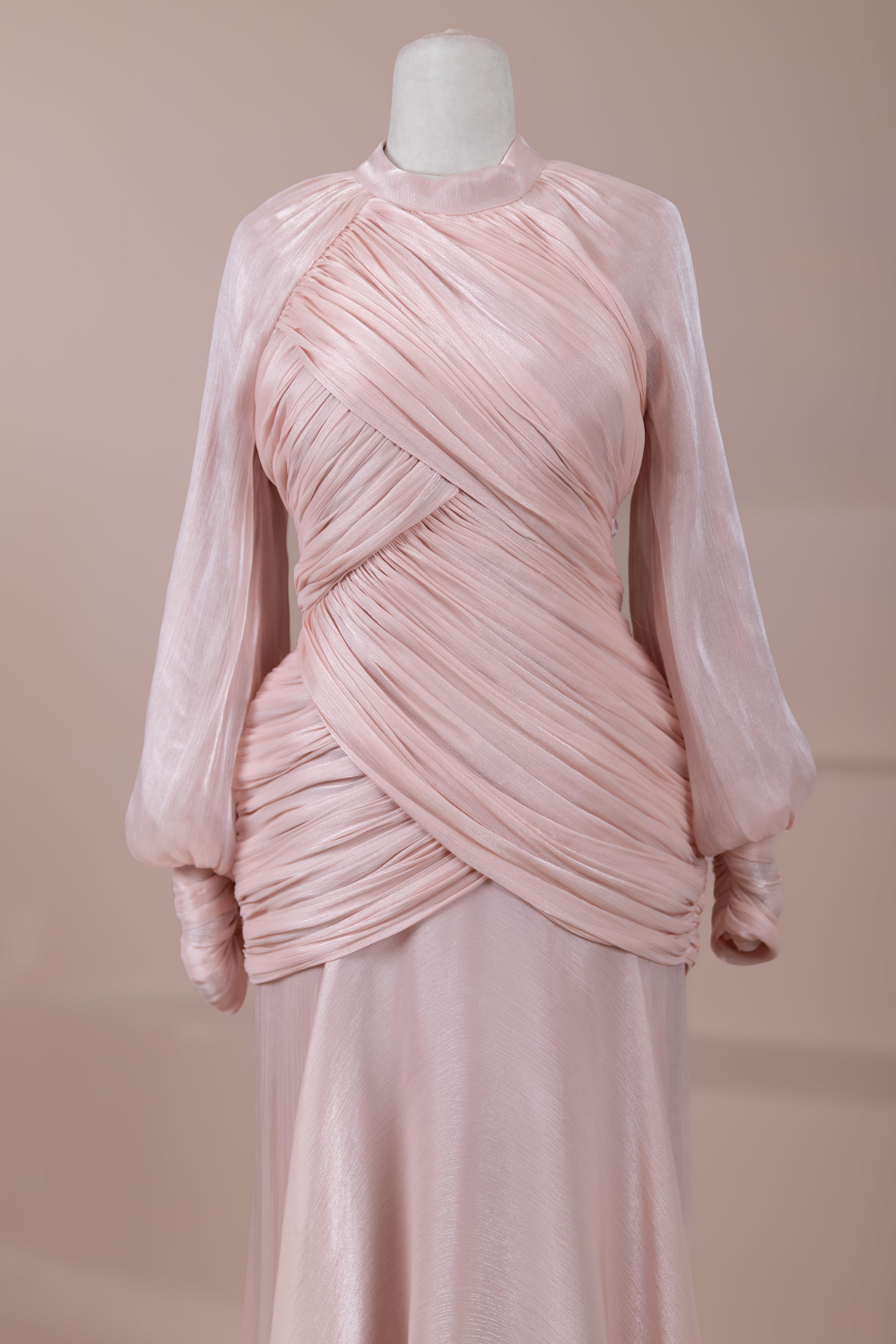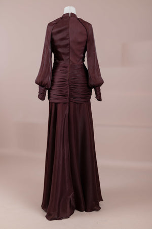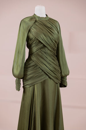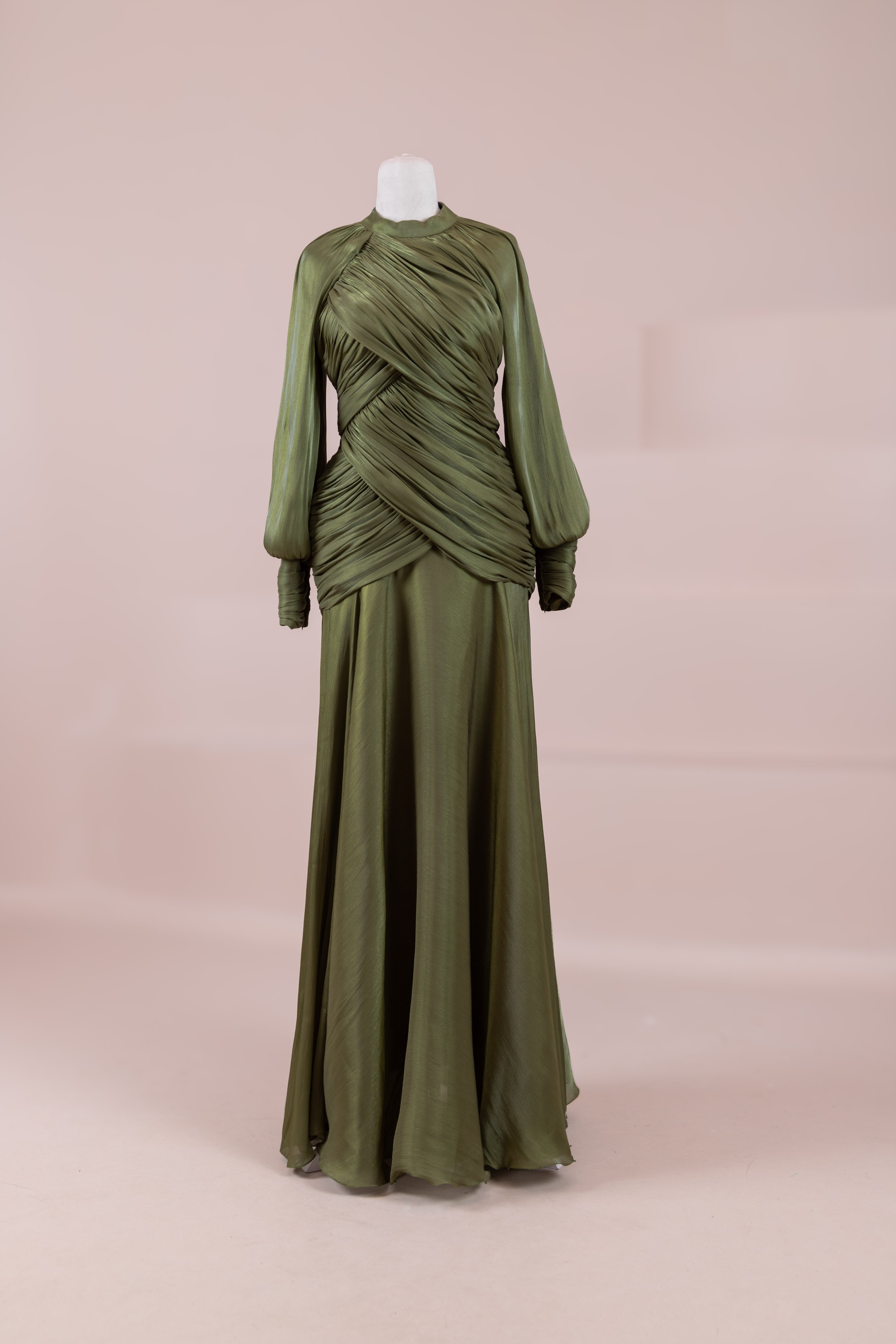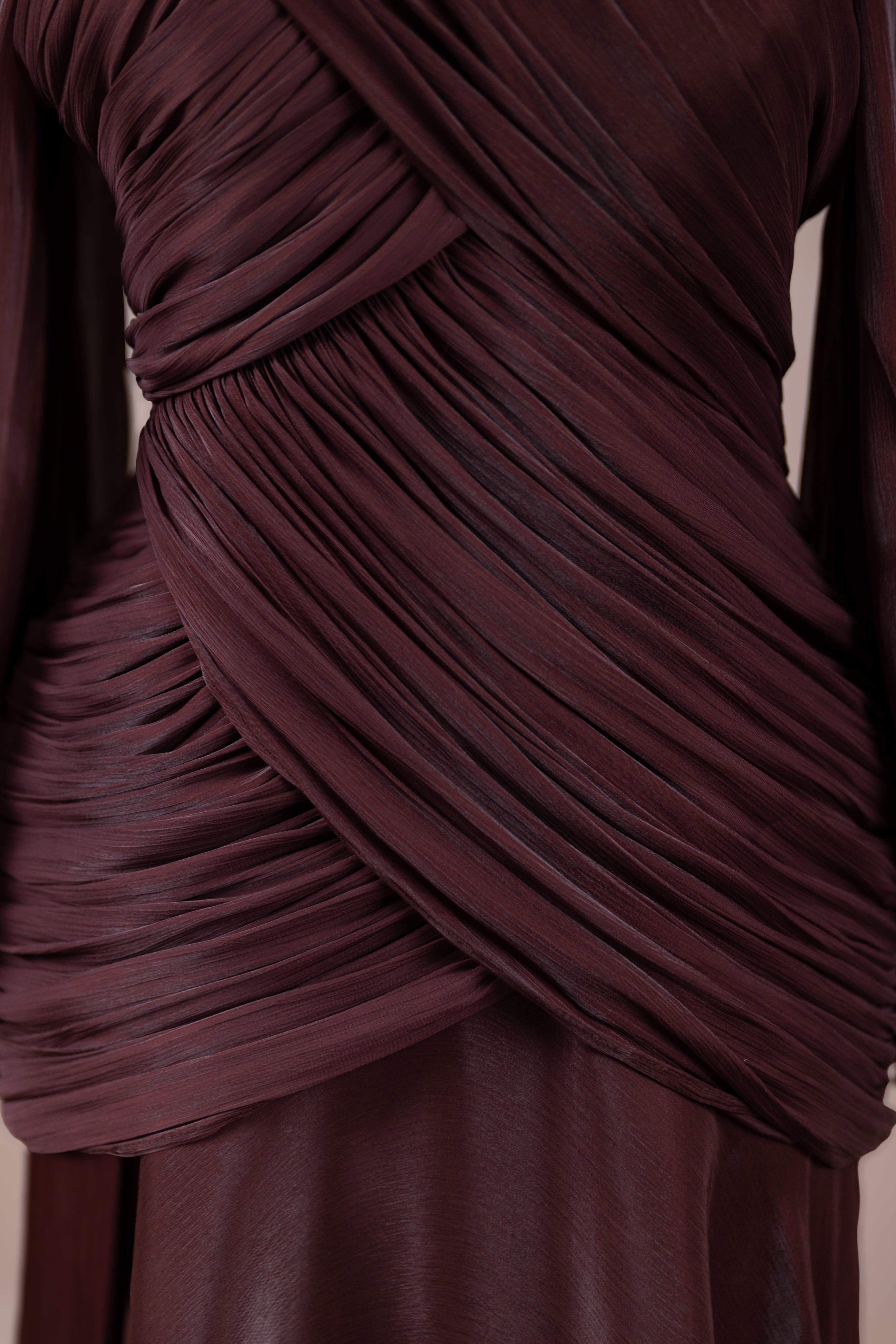Cette création élégante et fluide présente une silhouette féminine grâce à son haut drapé ajusté au corps et sa jupe fluide. Sa coupe à col haut et manches longues confère un look sophistiqué, tandis que les détails drapés croisés à la taille sculptent la silhouette avec élégance. Les manches rassemblées aux poignets apportent un volume doux au design. La jupe longue et fluide offre liberté de mouvement et confort.
