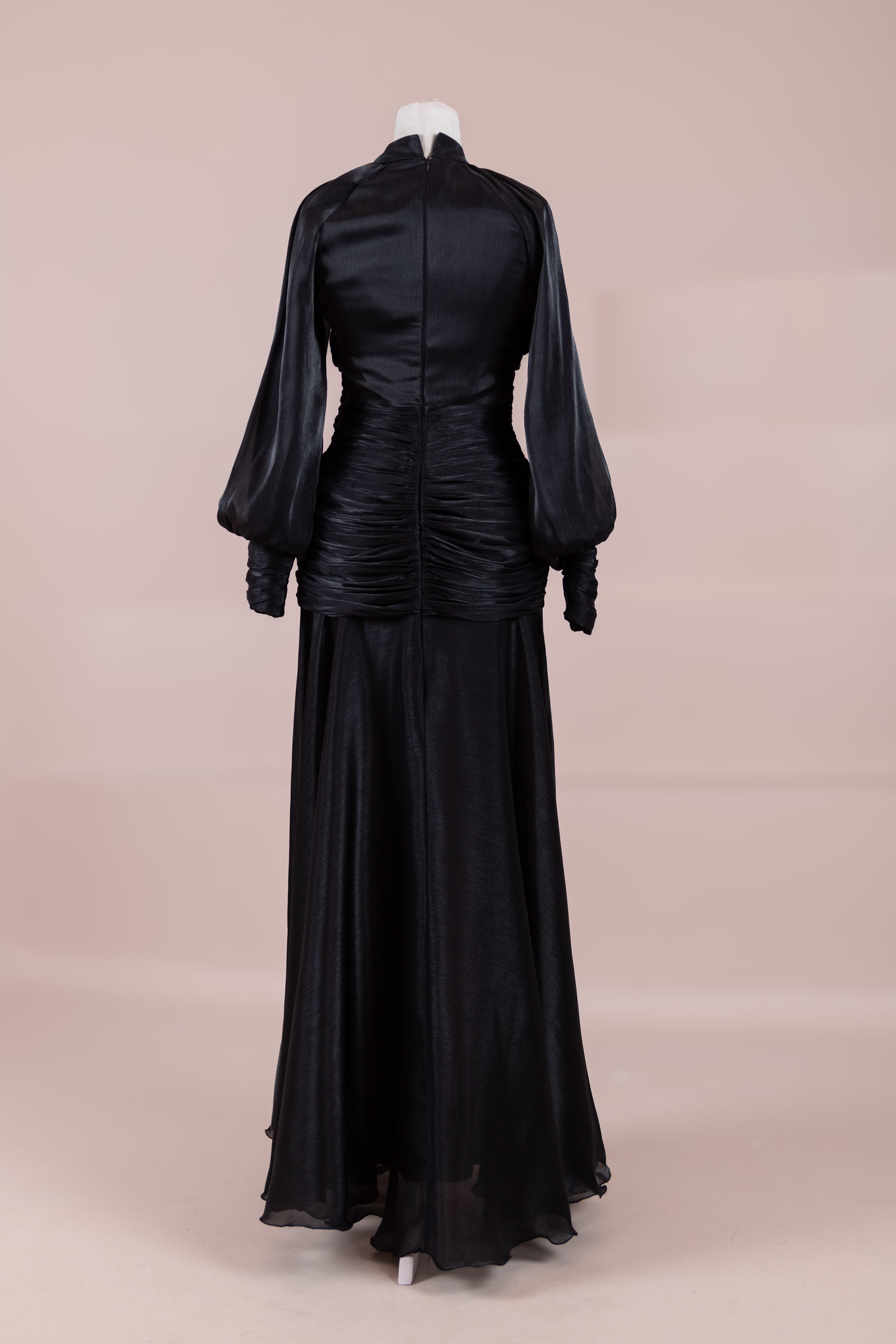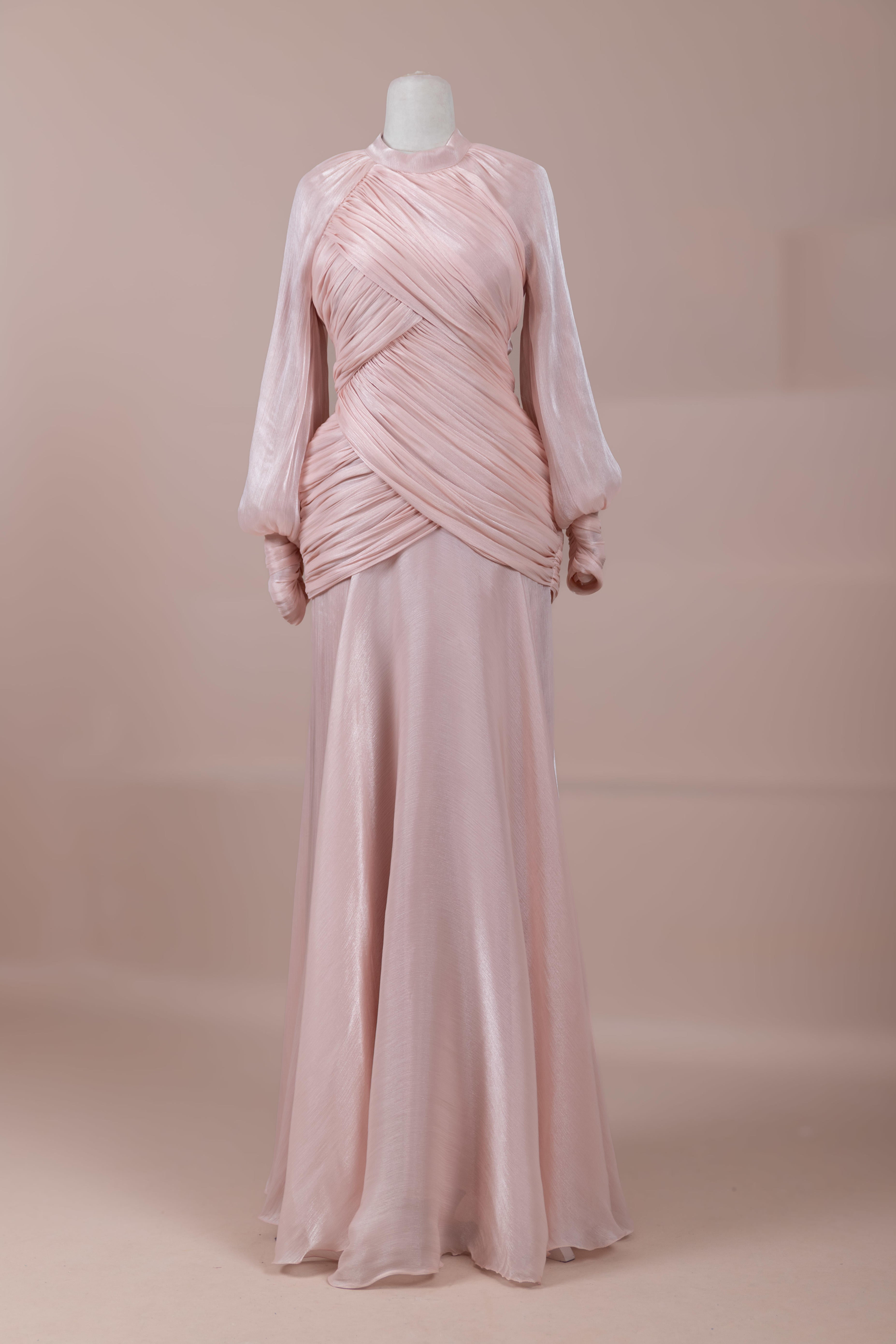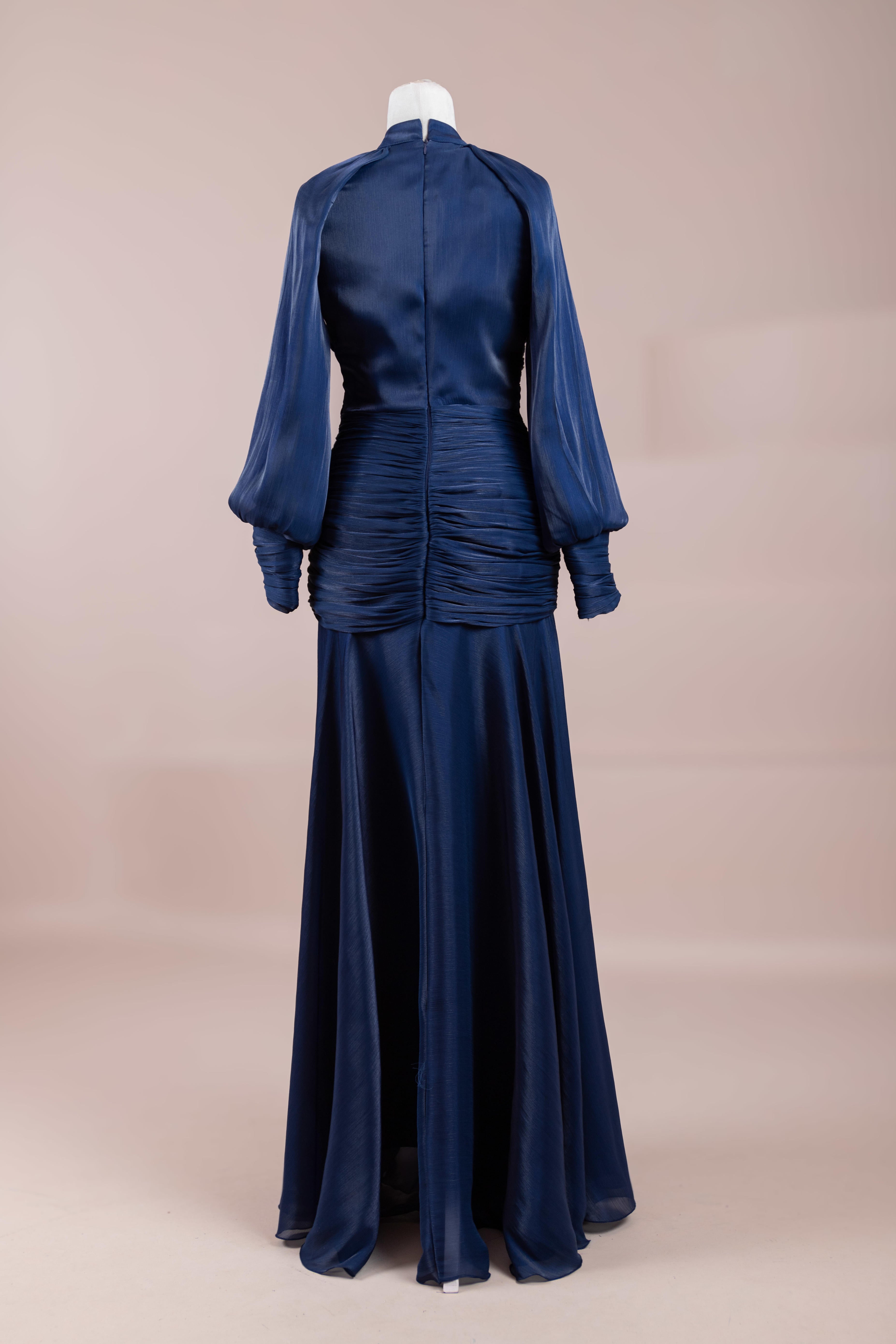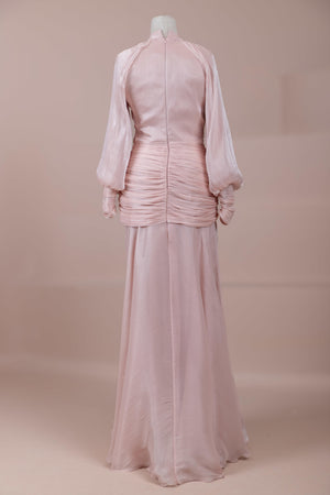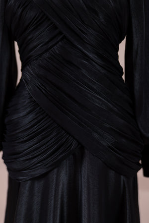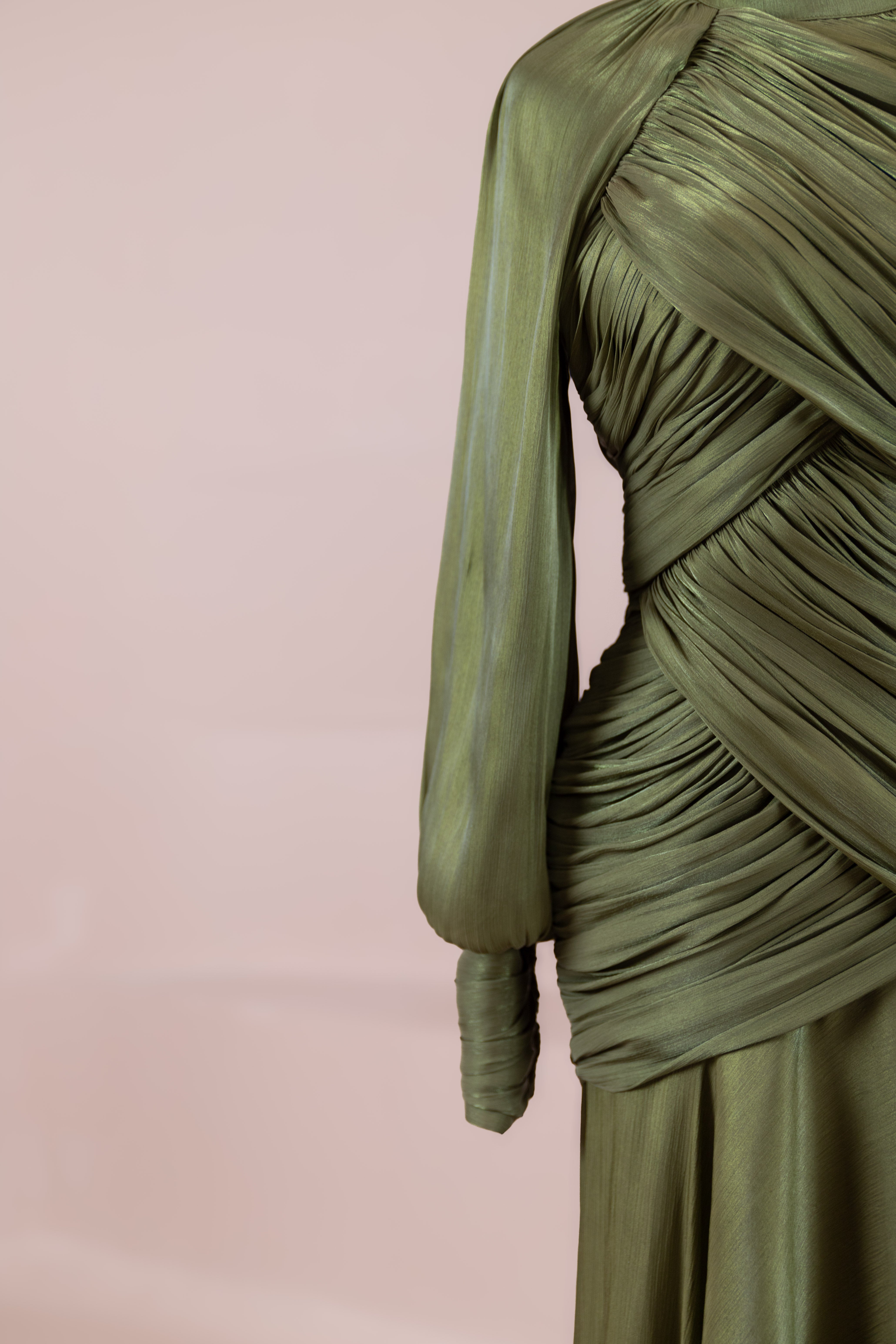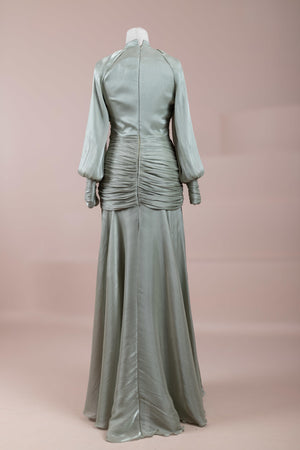 Cette création élégante et fluide présente une silhouette féminine grâce à son haut drapé ajusté au corps et sa jupe fluide. Sa coupe à col haut et manches longues confère un look sophistiqué, tandis que les détails drapés croisés à la taille sculptent la silhouette avec élégance. Les manches rassemblées aux poignets apportent un volume doux au design. La jupe longue et fluide offre liberté de mouvement et confort.