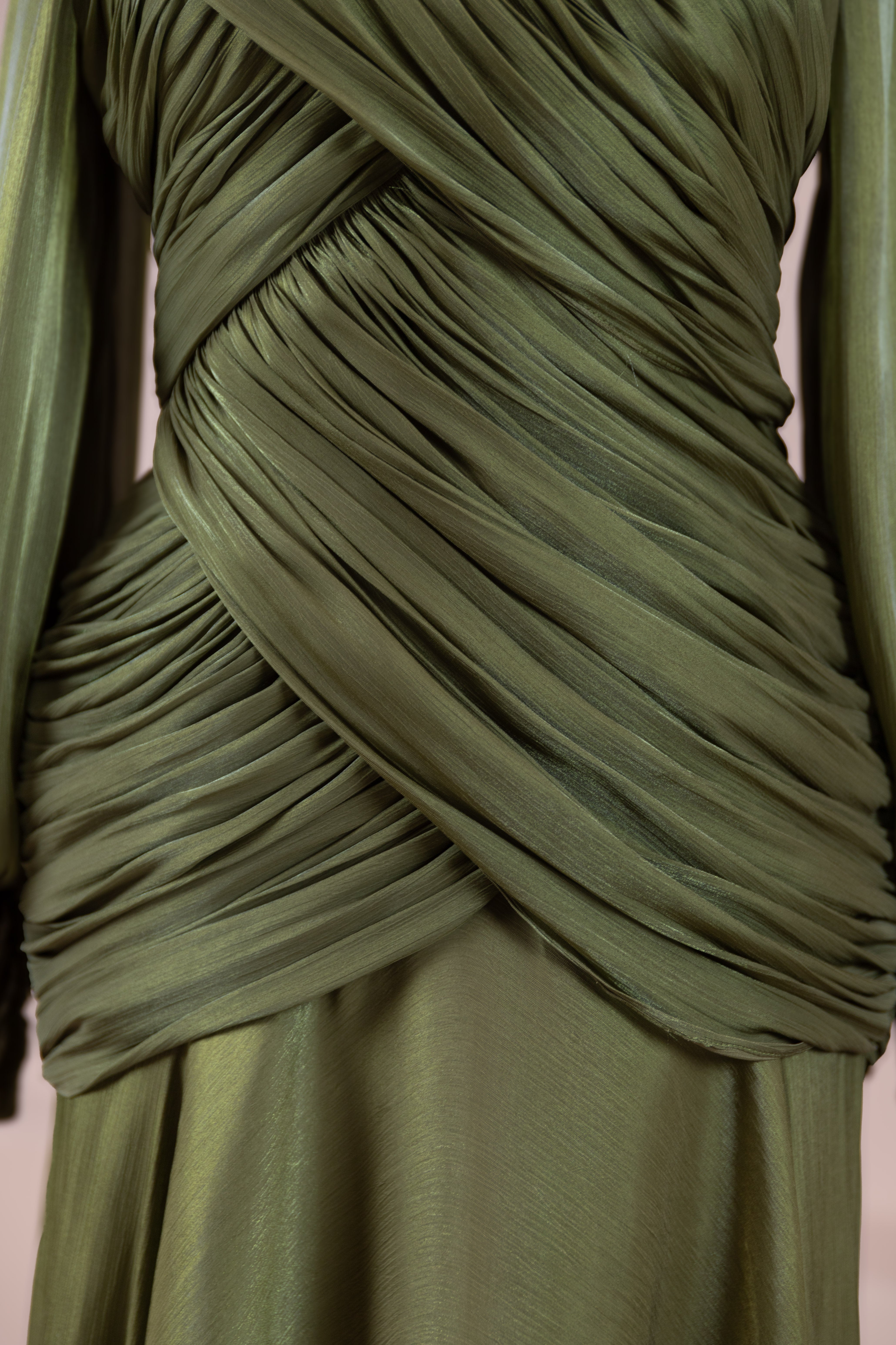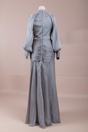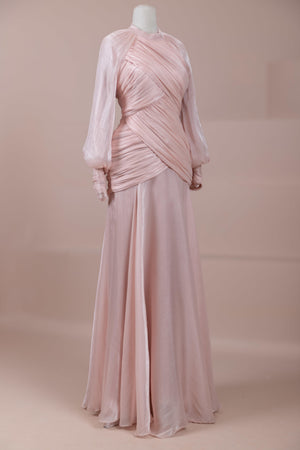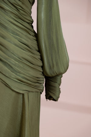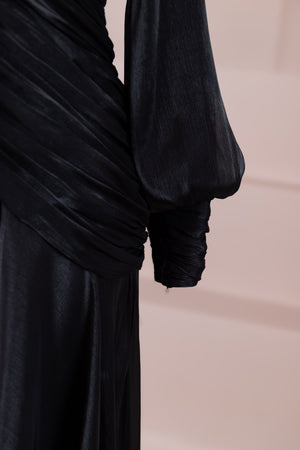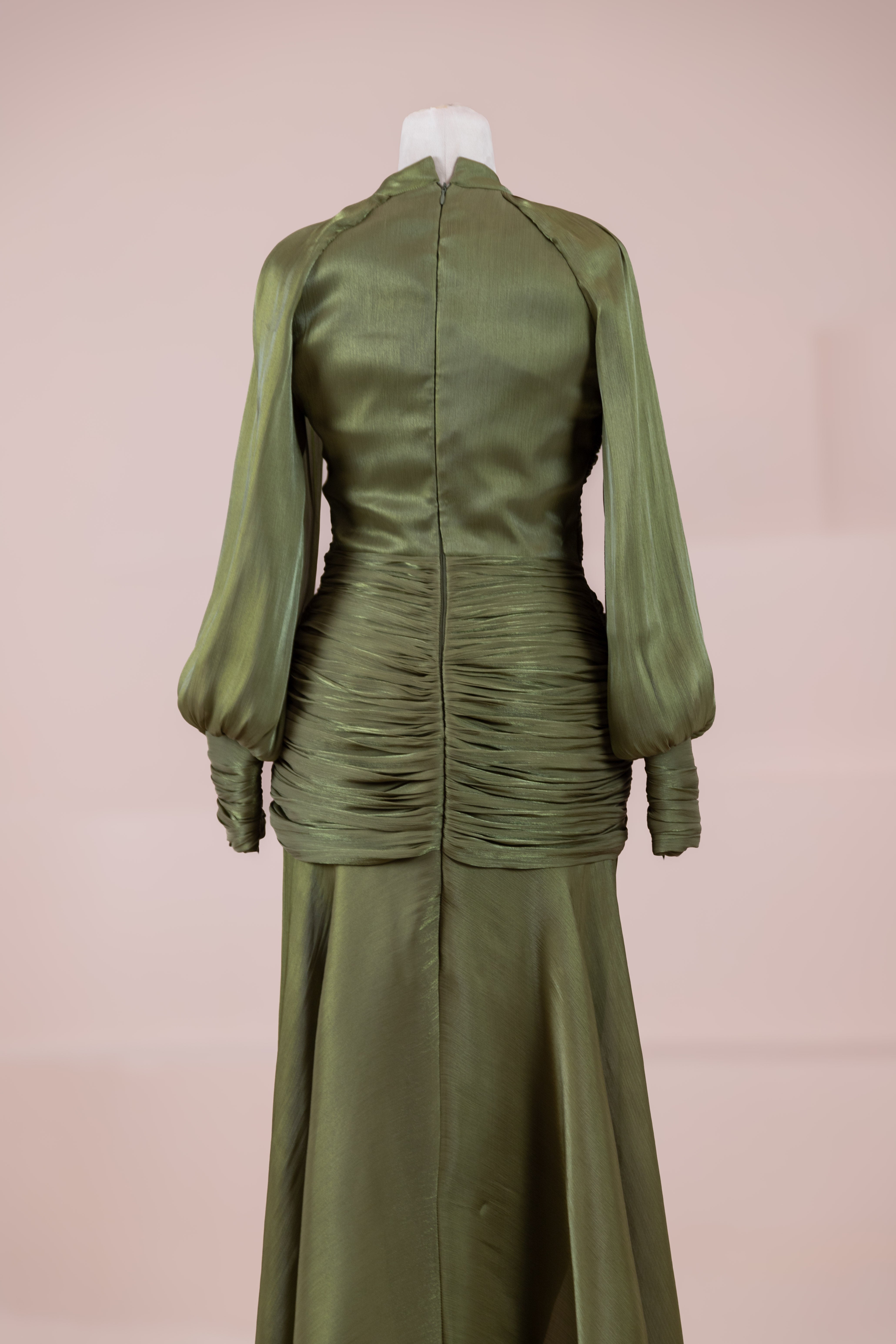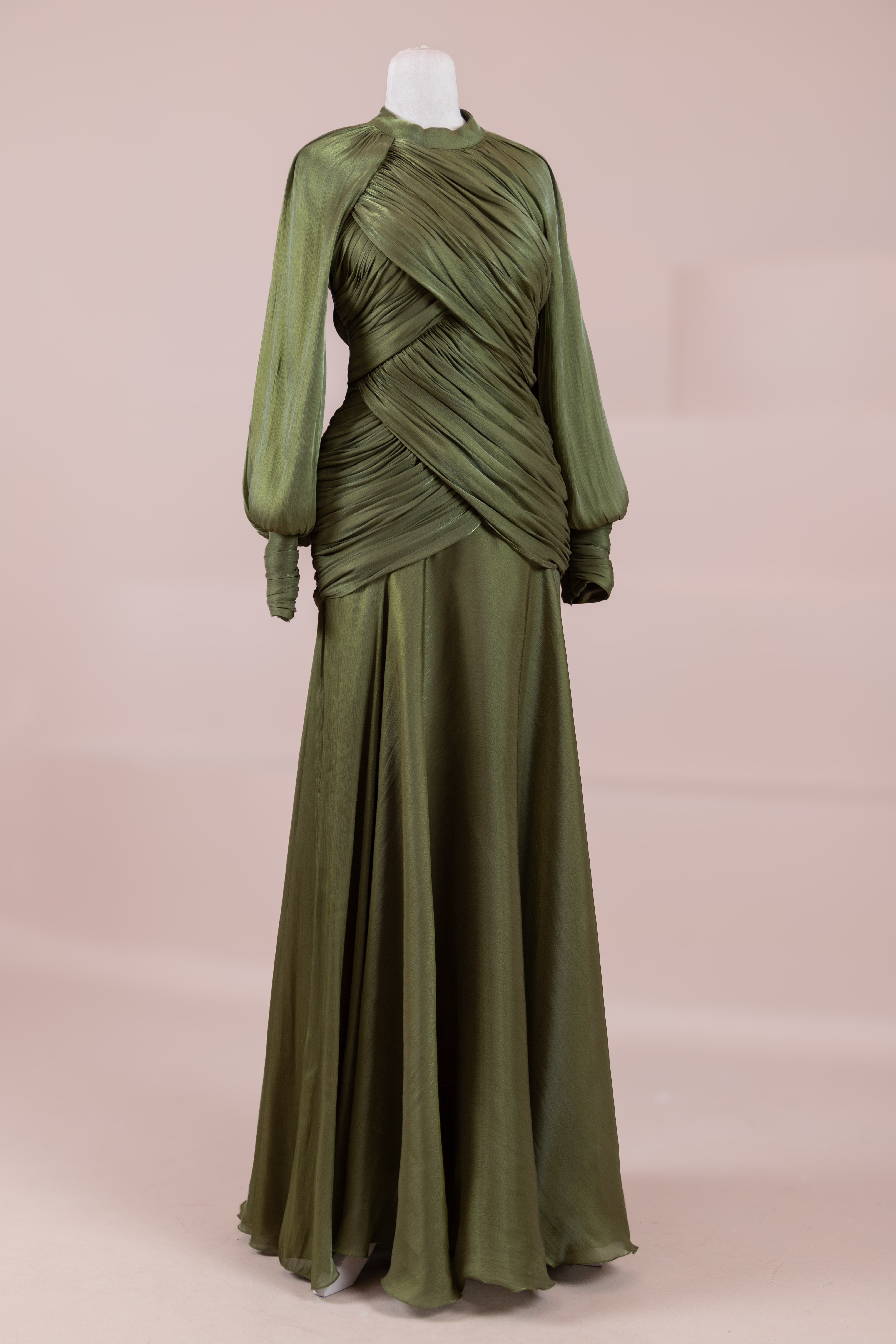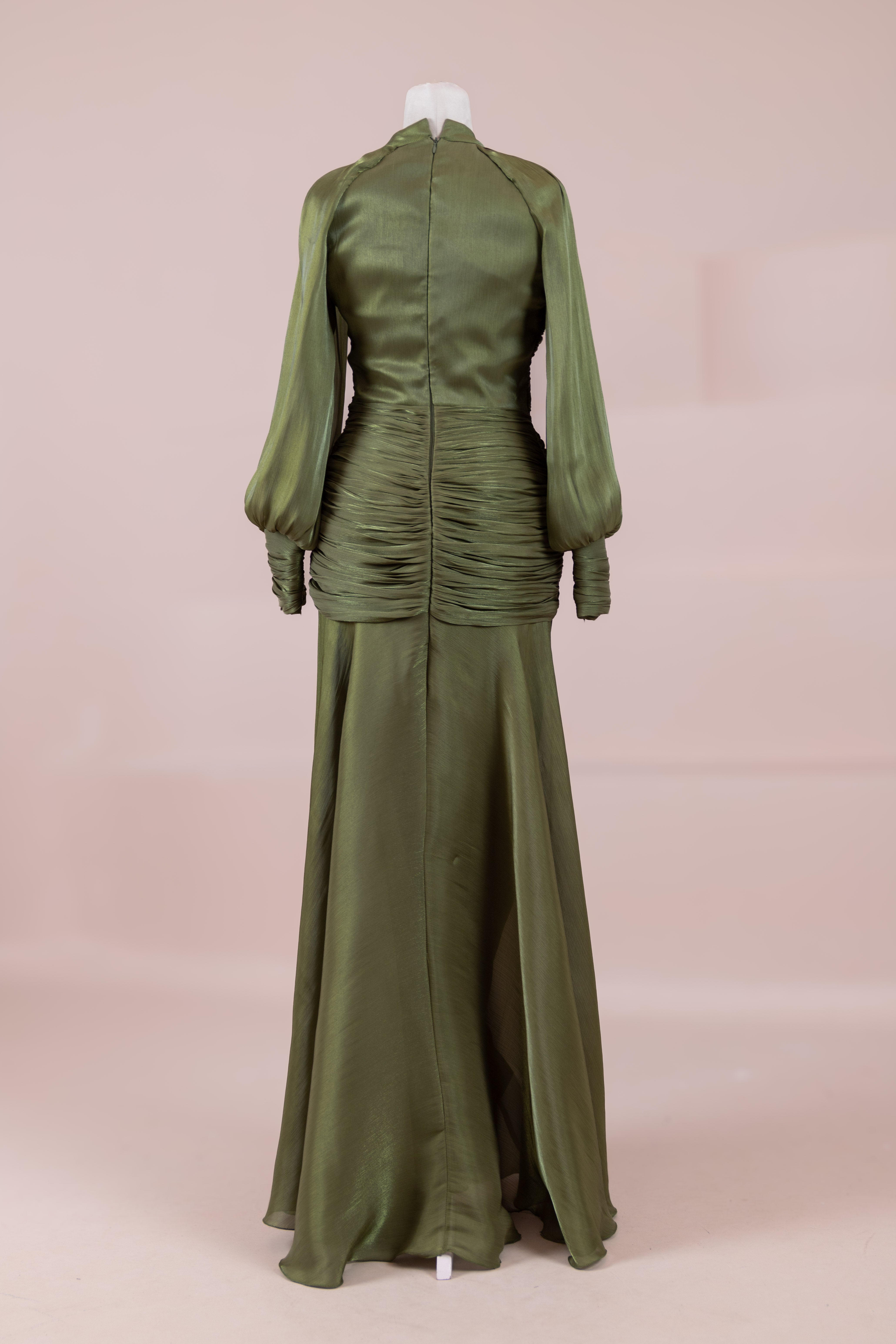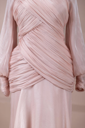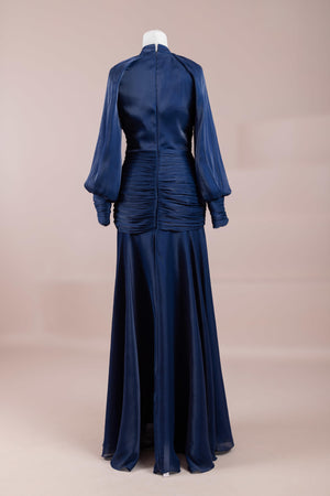 Cette création élégante et fluide présente une silhouette féminine grâce à son haut drapé ajusté au corps et sa jupe fluide. Sa coupe à col haut et manches longues confère un look sophistiqué, tandis que les détails drapés croisés à la taille sculptent la silhouette avec élégance. Les manches rassemblées aux poignets apportent un volume doux au design. La jupe longue et fluide offre liberté de mouvement et confort.
